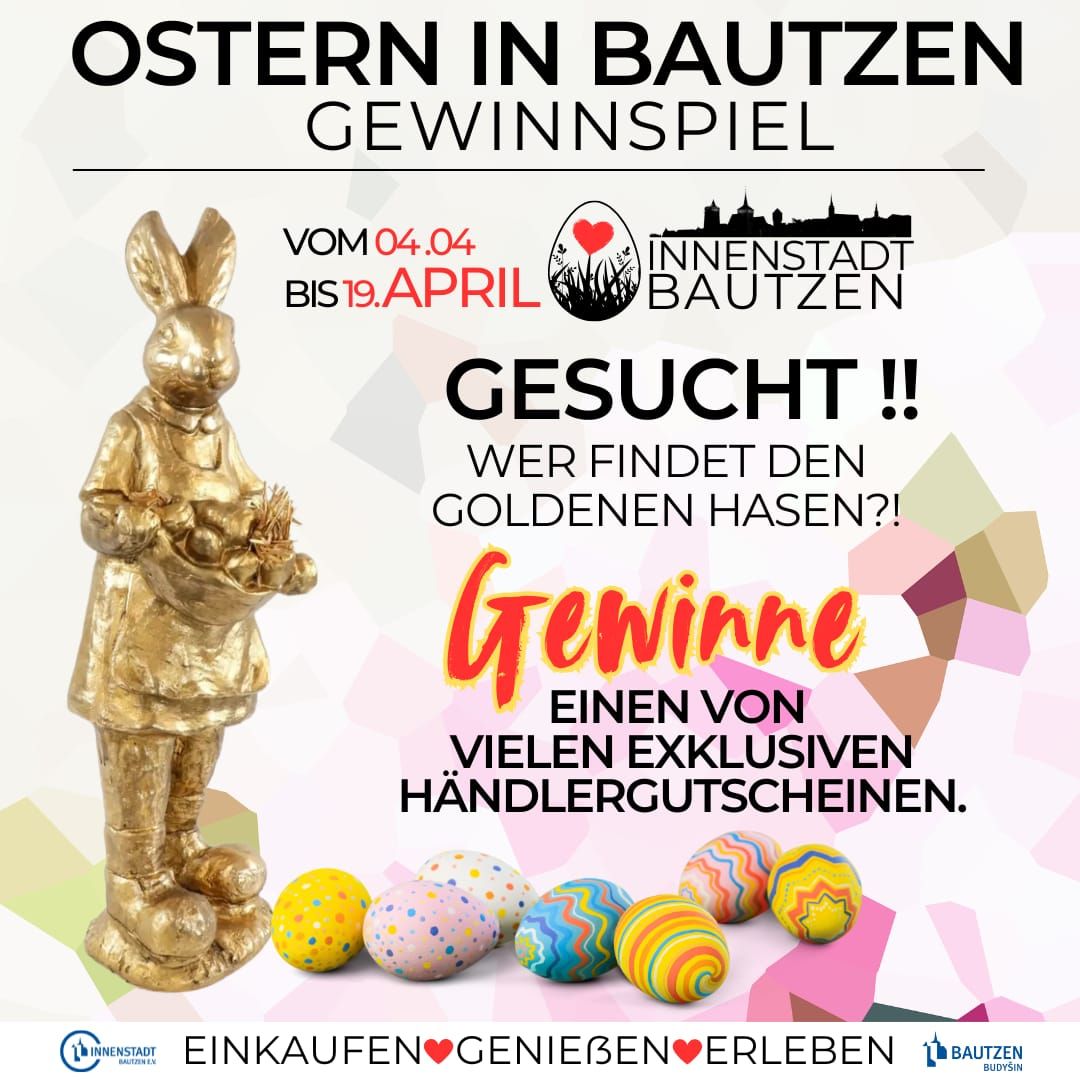 Wer ihn entdeckt macht mit dem Goldenen Hasen ein Selfi (gern darf es auch verlinkt mit uns Innenstadt Verein Bautzen gepostet werden) und sendet das Bild an unsere E.mail : info@innenstadt-bautzen-ev.de
